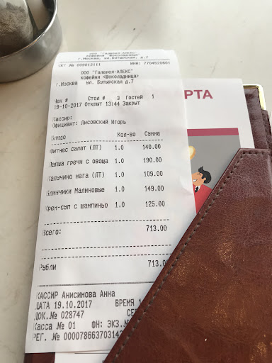 Ужасно. Пришли на ужин с мужем. Все светлые кресла грязные в пятнах, вся обстановка не уютная из-за грязи, на входе никто не здоровается. Официант был отвратительный. Разговаривал ужасно тихо, просто не слышно ничего, со стола убирал только когда просили мы, попросили воды - только в бутылке за 150 рублей. Ок, купили. Но её нам никто не нёс, пока мы сами не сходили на бар и пока не потребовали. По меню, при заказе ужина, скидка 30% на десерты. Её нам никто не пробил. Только когда конкретно ткнули пальцем в пункт меню с недовольством изменили сумму. А теперь о еде. Половина списка из меню просто нет в наличии, ешьте что придется и осталось. Ау, мы в Москве, мы пришли за 3 часа до закрытия, как так??? Ладно. Заказали еду. В салате цезарь были жухлые листья. Паста Альфредо была ООО очень маленькой порцией с таким мизерным количеством курицы, что ужас. Просто отварные макароны, горсть, с соусом и щепоткой курицы. Как этим можно наесться и зачем говорить, что это ужин? Заказали на десерт творожное кольцо - оно было все напрочь сухое и старое. Никакого наслаждения десертом. Оплатить в приложении можно, но цены расходятся с реальностью, поэтому только официанту. Я люблю шоколадницу и постоянно посещаю её в разных районах города, так как качество было всегда. Куда не придёшь - одинаково вкусно и приятно. Но не здесь. Это сама ужасная шоколадница из всех, которые я видела....
