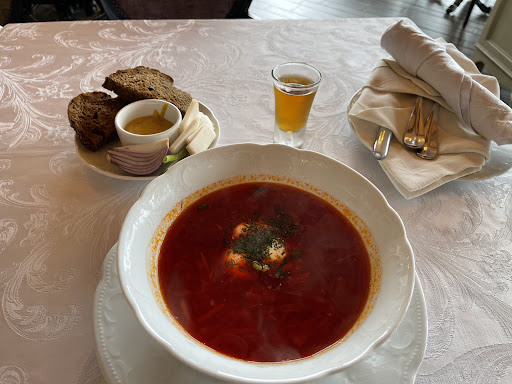 Приехали на обед около 13.30; Алексей зарезервировал нам очень классный стол на открытой веранде; обед выше всех похвал! Борщ - просто пушка!!! Брали еще стейк, соленья, закуску с картошкой и селёдкой; и на десерт чизкейк и пирожное картошка. Всё было просто супер, я так рада, что мы выбрали «Усадьбу» для первого знакомства со Смоленском гастрономическим...