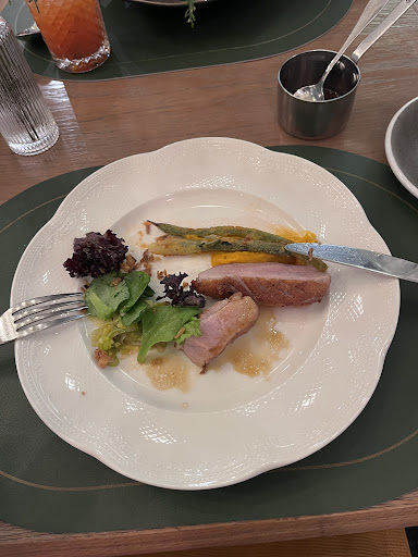 Утка: сухая, приготовлена плохо. Всего два кусочка, ни о чем. Соус был вкусный и тыквенное пюре тоже, но салат был стремный: невкусный пареный лук-порей и горький коричнево-фиолетовый салат из которого выпадали обжаренные орехи.