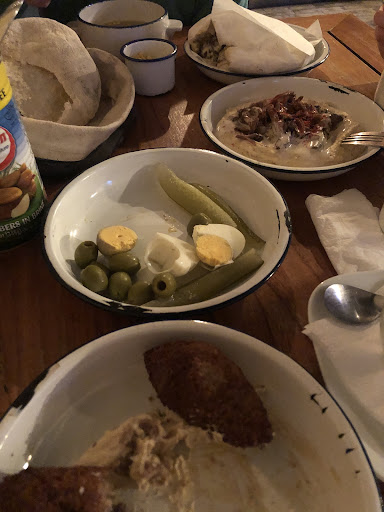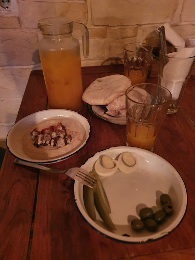 Интерьер с намёком на аутентичность: приглушенный свет, аля кирпичные стены, громкие разговоры на кухне, движ и смех, еврейская музыка, - как-будто оказался в небольшой телевской фалафельной.