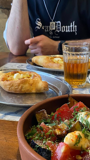 Интерьер: очень приятный в стиле неогрузинского шика, негромкая музыка - комфортно общаться. Сервис: достаточно медленный, администратор разрывается между гостями и постоянно прибывающими курьерами на доставку, в зале 2 официантки - по ощущениям нужно бы 3, тк долговато получается. Аналогично и с кухней - видимо и на доставку, и в зал готовит одна и та же смена и получается ожидание салатов 25 минут. Кухня: в целом на тройку с плюсом из 5, мы заказывали следующие блюда аджапсандали - это просто кол, брать не стоит - перетушенные овощи, кислая заправка, внешний вид неаппетитный; салат с хрустящими баклажанами - помидоры в нем стеклянные будто из Магнита, баклажаны вкусные, но не хрустящие точно, вкусная заправка, салат в целом на четыре балла из пяти; 12 хинкали с мясом и зеленью - хинкали не понравились, тесто жидковато для них, не накатанное эластичное, а очень тонкое и из-за этого такая «сопливая» текстура, или же их переварили; при этом фарш вкусный, сока внутри много, но тесто портит впечатление - хинкали на четыре с минусом; хачапури по-аджарски - тоже на четыре балла, начинка тонким слоем, запекается до жесткого состояния - не хватает жидкости в ней, отломить кусочек теста и макнуть в начинку не получится, по сути это булка с сыром, но булка вкусная; чёрный чай с чабрецом в чайнике - заварка крупнолистовая, но невкусная - очень среднего качества, конечно от заварного чая ожидаешь лучшего качества, подаётся в оригинальной толстостенной глиняной посуде; узвар - приятный вкусный компот из сухофруктов; морковный пирог - суховат, скорее это морковная запеканка с изюмом, разогретая в микроволновке - часть была теплая, часть холодная.