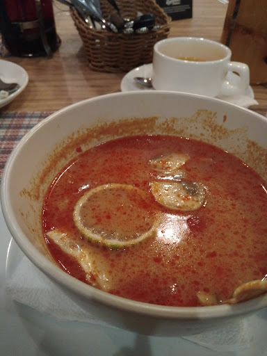 Read moreПросторное местечко. Меню представлено различными кухнями: от восточный блюд до блюд на гриле. Имеется отдельное жесткое меню. Хорошая чайная карта. Представлена свежая зелень, вкукты и овощи. Опробовала местный фирменный десерт - осталась довольна. Пропитанный, умеренно сладкий и нежный вкус у тортика. Попробовала пиццу - осталась довольна: потрясающее тесто, ктрое покрыто достаточным слоем начинки. Уравновешивают друг друга. Суп "Том Ям" с морепродуктами порадовал изобилием и свежестью морепродуктов, а лайм предал небольшую нужную кислиночку. Всё представлено красиво. Цена на человека в переднем 500-600 рублей, но...