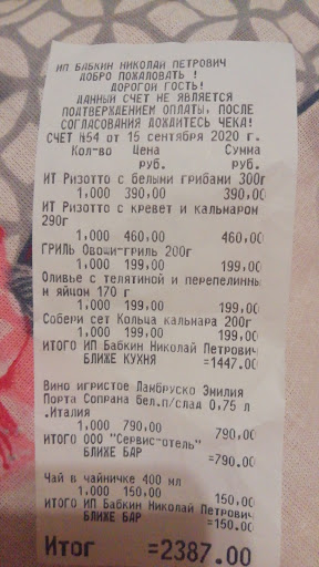 Двоякое мнение оставило это заведение. Сама обстановка, дизайн, конечно ресторанные, сравнения с бывшим Обжорным рядом никакого. Красиво. К официанткам тоже претензий нет. К нам девочка бегала постоянно, наливала, приносила, убегала. НО про меню: пасты Карбанары, зсявленной в меню не было, взяли предложенное ризотто с кальмаром. Рис в ризотто каша кашей, и с кальмаром не вяжется+ добавлена груша на гриле. Экзотически, и извините, не вкусно (( Ещё минус-удивил касс чек, сам его вид, офицантки обьяснить ничего не смогли. Только причитали, если вам нужно со штрих кодом, вы скажите, мы пробьем. Так и не пробили. А почему сразу то правильный, зарегистрированный на сайте налоговой, не выдаете? Вообще-то это питание, если я отравлюсь, кому, я чего докажу с вашим филькиным чеком? И только дома я внимательно прочитала верх этого чуда,, чека,, о том, что он и не чек. Удивительно. Еще и примешали в ИП Бабкин внизу ООО за вино- всё в кучу. Читала отзывы в дубль гисе, одни плюсы, все в восторге. Вы их сами написали? Смешно, обратите внимание, есть практически скопированные фразы. Найдите умного бухгалтера и хорошо готовящего повара, на одном интерьере...