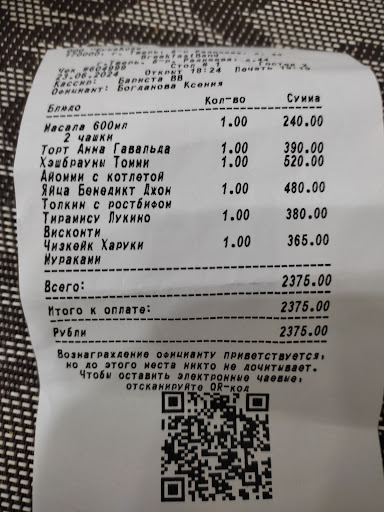 Read moreБыли с мужем в первый раз в этом заведении месяц назад. Просто понравилось всё. Через пару недель не смогли туда попасть, не было свободных мест. Сегодня зашли туда ещё раз, пара столов была свободна. Еда там очень вкусная, интересная. Жаль, не сделали фотографии. Напишу честно по своим ощущениям. Мне принесли Яйца Бенедикт, показалось в начале - большое количество ингредиентов в странной мешанине и очень всё красиво уложено. Когда я попробовала, это оказалось невероятно вкусно, все ингридиенты сочетались между собой, особенно выделялись говядина и яркий, сладкий на вкус карамелизованный лук. Десерты там очень вкусные. Мой муж, большой поклонник Black Sabbath, выбрал Тони Айомми, тоже остался очень доволен. Единственное что замечу, Масала у них не классическая индийская, а более авторская. Официанты довольно приятные, сразу предупредили, ожидание горячих блюд будет 20-25 минут, но было всё гораздо быстрее. На последок, решила взять себе ещё десерт на завтрак с собой. Мы были там с маленьким ребёнком, что тоже для нас плюс в данном заведении. Не везде приветствуют посетителей с детьми, особенно с маленькими, там же атмосфера очень дружеская и семейная. Туалет всегда очень чистый. Кофе там тоже...