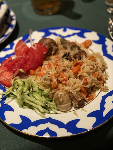 Read moreАтмосферный ресторан как для любителей культового фильма, так и для тех, кто о фильме имеет весьма смутное представление. Ощущение, что ты оставил за резными дверями современную Москву и нырнул в затейливый мир революционной Средней Азии, старательно воспроизведенный на "съемочной площадке". Когда меню изучено, сделан заказ, есть что "порассматривать". Сразу скажу, что ресторан не самый дешевый. Дороже сети Чайхона N 1. У нас ( без алкоголя - брали литровый кувшин натурального лимонада манго -маракуйя) получилось по 2500 с человека. Но качество еды выше. Попробуйте плов! Когда повар привозит столик с казаном и начинает накладывать плов на тарелку, то буквально слюнки текут, а рука тянется к мобильнику, чтобы срочно сфотографировать эту аппетитнейшую красоту. Впрочем, и лагман, и кутабы (с зеленью - сыром и с мясом), и шашлык, и чебуреки были очень вкусными. Всем понравились выбранные блюда. На десерт взяли по два ромбика пахлавы ( не сухая, нежная, одно удовольствие), именно по два - они небольшие и одного явно взрослому маловато для полного счастья, а уж если кому-то захочется три или четыре, то это на ваше усмотрение. Пили травяной чай - рекомендуем. Попробовали традиционный арабский кофе с кардамоном, приносят в турке - отдельное удовольствие. Словом, отлично отметили 8-е марта. Было уютно, очень вкусно, фоном играла приятная музыка ( не восток), не мешавшая общаться. И каждой даме от ресторана был сделан маленький, но очень приятный подарочек - роза. Несколько дополнений: Ресторан популярен - обязательно зарезервируйте столик. У ресторана есть своя парковка - для центра несомненный плюс. При ресторане...