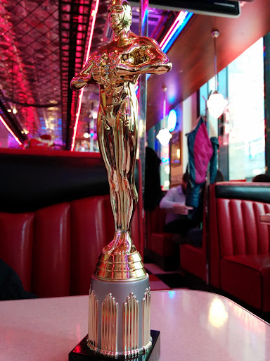 Colorful American-style diner with booth seating & plates of classic American comfort food.