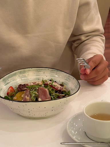 Ну да ладно) я заказал себе салат с уткой, и равиоли с кроликом. Жена взяла баклажановый салат и щучьи биточки. Также мы пили чай. Улун молочный.