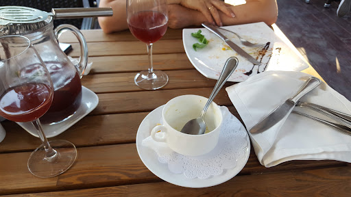 Минус: на столах стоят рекламы с алкогольными коктейлями и кажется все дети их спрашивали у родителей. А учитывая, что почти все были с детьми, можно днем такое убирать с глаз. Если бы поставили безалкогольный коктейль или какой-нибудь Лимонад в такой рекламе, то продажи дополнительные были бы точно. Особенно с учётом жары.