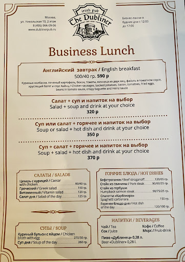 Время работы: С 12:00 до 17:00 - очень хорошо! Время обеда: От размещения до чека - 25 - 30 минут! Быстро. Деньги: от 320 рублей. Приемлемо! Лирика: Стильные и очень удобные приборы, как будто знают, что это моя слабость. Пиво в составе бизнес - ланча - это предательски круто: "Дублинец" - отечественный ИПА, достойного качества. Честные пол пинты. Если не за рулем, то на обед - самое оно. Хотя "Марстонс Ойстер Стаут - вельми кузявее! Хорошая подборка брендов на кранах. В качестве салфетки - газетка «The United Pubs». Персонал: милый, вежливый, расторопный. Сервисные диалоги на уровне. Меню знают. Выдача скользящая, ждать не...