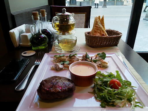 Very bad experience ! Correct food. Friendly waitress ... Free toast, free digestive ... Too good for real!! When paying the bill, we leave tips of 300 rubles ... This is where things get spoiled: the waitress comes back with the 300 rubles and tells us that tips are not enough! That it's the weekend and for this reason it 's necessary to leave more .. I answer to her that it's not normal to require tips. She insists saying that if we are happy with the meal we must leave 1000 rubles. I answer her that normal tips are between 5% and 10% and surely not that amount! She still insists, more cheeky. I tell her that it's dishonest to insist like this, that tips are suggested and not compulsory and that, in theses bad conditions we 'll leave a negative opinion on Tripadvisor or GOogle because we have never seen such an attitude .... she still claims , that we are a group of 5 etc. We end up dropping 200 more rubles: 500 rubles in total! Still unhappy, she leaves upset and we leave the restaurant as well. In short, are the employees of this restaurant so badly paid to be so aggressive? Do their bosses press them to the point of being forced of racketeering ?! A SHAME! No other restaurant in Moscow demanded tips from us during our stay! Never seen that, neither in Russia nor elsewhere!