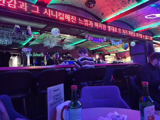 Красивое место, повсюду картонные стенды с каким-то корейским мэном, правда, друзья кейпоперы утверждают, что это разные чуваки :DDD Атмосфера очень классная, музыка ненавязчивая, неоновое освещение крутое.