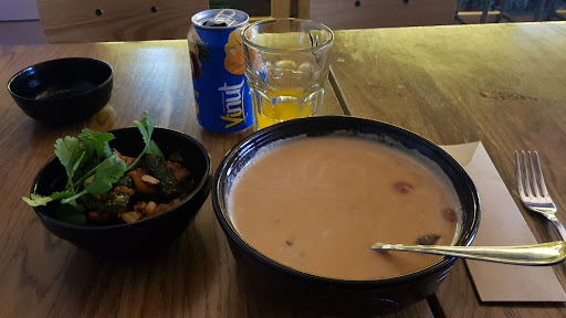 О меню. Том ям могу уверено рекомендовать. Бульон наваристый, густой, видно, что кокосового молока повар не пожалел. Креветки крупные, их достаточно. в моей порции было штук 5. Небольшой минус для меня - подача супа с рисом. Я лично предпочитаю Том ям с лапшой. Но это исключительно из-за моей безграничнойлюбви к лапше. Битые огурцы - вкусные. Хотя их, в принципе, испортить невозможно. Из напитков я попробовала какой-то сладкий сок в алюминиевой банке и кофе по-вьетнамски. Не советую. Баночный напиток на вкус как обычный пакетированый сок из магазина, только значительно дороже. Кофе по-вьетнамски очень водянистый и слабый. Радует только, что сгущенки добавили не слишком много.