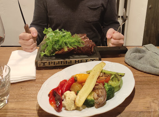 Read moreИнтересное место с притягательным названием: бородатые мужчины предлагают брутальные блюда. Понимаешь, что рыбы точно нет, как, видимо, и бритвы нет. Бородатый персонал - это стильное и удобное решение. Человек, привыкший полагаться на физиогномику, будет моментально и надолго сбит с толку. А бородачи (официанты) попадаются разные. Если вы попросите не класть зелень и перец в первое, но забудете, не скажете того же о другом блюде - вам будет предъявлено, что виноваты сами: "вы говорили только про суп" (с). Додуматься и спросить - это не к ним, причем системно не к ним. Почему, попробовав, вы не стали доедать свое блюдо - бородач не спросит. Почему вы не притронулись к салату на доске с тяжелой закуской - никого не интересует. Интерьер интересен и приятен, но в тесноте, которая в этом месте имеется, его без усилий не разглядеть. Удобные кресла мне не попадались. По кухне хочется высказаться хорошо, но есть неприятные моменты. Бургер там лучше не брать. Вообще никогда. В настоящее время у бургеров приличная конкуренция и в рыбынет это прямо провал. В самую бездну. Очень странная булка, очень сухое, безвкусное мясо... Непонятно какого лешего в мясном ресторане с бородатой претензией. В прожарку стейка с первого раза могут не попасть. Иногда понимают это сами, сами переделывают. Перетертый в кашицу очень сомнительный по сути своей тар-тар. Я много где пробовал тар-тар. Такой-же близкий к пюре мне попадался во Франции, но он был космичен и богичен. Снова возникает вопрос: что с мясом? Заправка была адекватной. Замечательное картофельное пюре(!): по вкусу, составу и консистенции. Рекомендую суп из бычьих хвостов. Сказочная печень. Настоящее чудо. Что-то подобное я пробовал в Австрии, но с печенью у рыбынет проблемы однозначно нет. Мне кажется ее бы оценили даже те, кто не переваривает ливер и прочие прелести :) Замечательно. Очень эффектен и эпичен костный мозг. Его подают в продольно разрубленной кости, сложенной на доске буквой Х. Ассоциативный ряд у каждого свой, я увидел поджаренный на гриле Андреевский крест. Но это меня не смутило :) Смутили меня палочки, такое лучше выковыривать чайной ложкой. И смутил меня сожженный хлеб. Видимо им вытирали гриль. Кушал я с удовольствием. На сгоревшие сухарики намазывал азартно. Может быть не очень скоро, но все же я зайду в этот ресторан снова. Возможно закажу тар-тар. Но совершенно...
