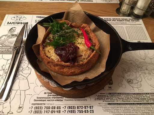 Went there for the first time and was pleasantly impressed by both the food, the decor and ambiance. Obviously, vareniki (and their cousins, pelmeny) constitute the biggest part of the menu, but yummy can also find salads, traditional appetizers (zakuski), bliny (crepes), desserts, etc. There is even the "fitness" menu, although that's not what I'd ever recommend :). This particular place is nicely decorated with a lot of artifacts from "the good old days of the Soviet Union", including the ancient public soda dispensing machine, old rotary phone, skis, etc. Tv screens decorated to look old-fashioned play old Soviet movies and the pop music from 1980-s plays there...