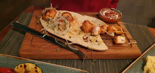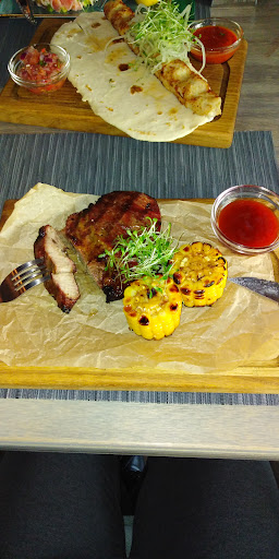 В первый раз пришли сюда,муж хотел попробовать стейк,попробовал он рибай,ему не совсем понравилось,говорит что в другом заведении поблизости стейки вкуснее. По мне,стейк был сочный,мягким,средней прожарки,не болтается во рту(бывает жуешь жуешь без конца,в итоге выплевываешь или проглатываешь,т.к прожевать не получается)тут прожевал-съел)))Детского меню нет,но нам официант предложил пюре и шашлык из курицы,пюре очень вкусное,гомогенный состав,быстро был съеден ребенком,курица как курица🤣неплохая,но я ела вкуснее))Ребенку дали раскраски,причём все карандаши и фломастеры в идеальном рабочем состоянии😏у мужа салат был из печеных и сушёных баклажанов,помидоров,и под каким-то соусом знакомым,то ли ореховый был(с которым едят водоросль чуку😎)С 20.00 была живая музыка))Я думаю,еще сюда придём😉Персонал приветливый и приятный😎Интерьер ресторана симпатичный))Овощей на гриле я себе представляла...