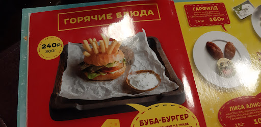 Подали детское блюдо Буба - Бургер! Ребенку в рот не лезет булочка!! Соуса с картинки нет! Зато картофеля фри наложили кучу - мы не поняли! - молча подали ребёнку 3х лет - давился да кушал сколько смог!! Хотя! В нашем рационе вообще никогда не было картошки фри - я противник этого блюда вообще!