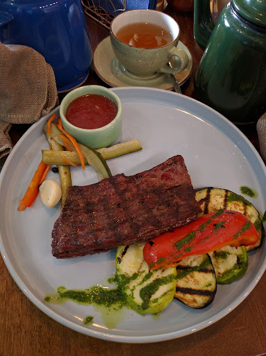 Read moreЗаказывали: стейк мачете с овощами гриль - вкусный, сочный, прожарка медиум идеально! Том Ям - аромат то, что надо, а вот вкус так себе. Десерт вкусный, а вот салат из овощей с семечками - маленькая порция и странная подача на половине тарелки: ощущение что на чистую половину забыли что-то положить))) Интерьер понравился, панорамные окна - огромный плюс, открытая кухня - это всегда здорово, есть дровяная печь для пиццы. И отдельный респект за очень чистые туалетные комнаты, вот прямо не придерешься! Классная тема с желтыми шапочками)) Из пожеланий - сделайте диванчик/столик на входе, очень неудобно раздеваться и сдавать вещи в...