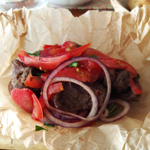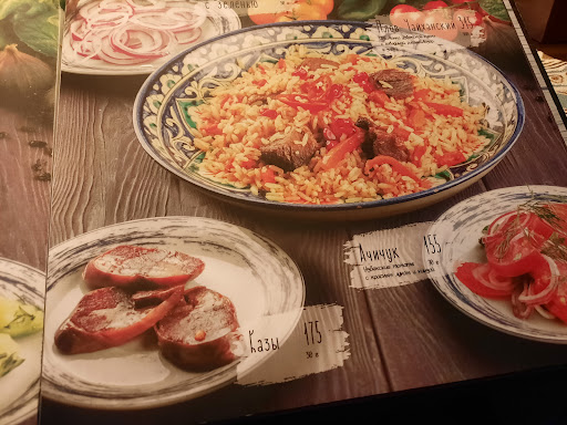 Read moreАтмосферное такое местечко совсем рядом с Мостом влюбленных. Понравилось, что на подоконниках лежат красивые подушечки и головные уборы разные интересные национальные, на стенах висят халаты нарядные, видимо, приятно выделяются чб фото пожилых людей, аксакалов, наверное, непонятно только, известные это люди или просто лица из народа, но интересно смотреть, пока заказ ждешь. Приятный тусклый свет, не режет глаз и все прекрасно видно, приятные лампы абажуры над столами, какие-то красивые резные люстры над другим рядом столов, за стеклом печка какая-то огромная, для выпечки лепешек, наверное. Меню дорогое, напечатанное книгой, с красивыми фото блюд, понятным описанием, производит хорошее впечатление. Цены средние - не скажу, что супер высокие, адекватные довольно - овощная тарелка около 200 р, бокал Киндзмараули 320 или 350. Плов заказала свадебный - баранина, изюм, - оч вкусный, другие блюда, что заказали мои друзья, тоже попробовала, вкусно)) Короче, поели, погрелись, приятно провели время. Музыка, кстати, национальная, очень приятно дополняет обстановку, не очень громкая, но хорошо слышная, это всегда нравится мне. Два зала есть - основной и кальянный, тоже хорошо, всем удобно, кто кальянит и кто нет)) Короче, была в первый раз, понравилось - меню очень разнообразное, чего только нет, есть, из чего...