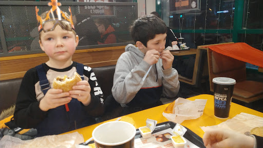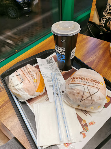 Первый раз недавно посетил этот Бургер Кинг (14 окт 2021). Помещение не большое, столики у окон самые привлекательные, но по посадке не совсем удобные. Как обычно сделаны так чтобы посетители долго не засиживались. Место брэндовое, тут много молодёжи тусует. По еде: заказал Чеддер Кинг XL, сырный Джо и безлимит напитки большой стакан. Я ожидал, что Чеддер Кинг будет большим и высоким исходя из названия. В итоге подали еле тёплый и прижатый бургер, который был стандартного размера. Подача на троечку. Сырный Джо был хоть и дешевле, но поинтереснее. Сотрудница помогла с заказом, терпеливо все объяснила и помогла скачать фирменное приложение, но почему то Короны не дали за счет заказа(уже позже после обращения в службу поддержки в приложении начислили Короны). Система хитрая и может не всем понятная. Средние бургеры, но все же намного лучше чем в Маке. Хотя что ещё можно ожидать от вредного...