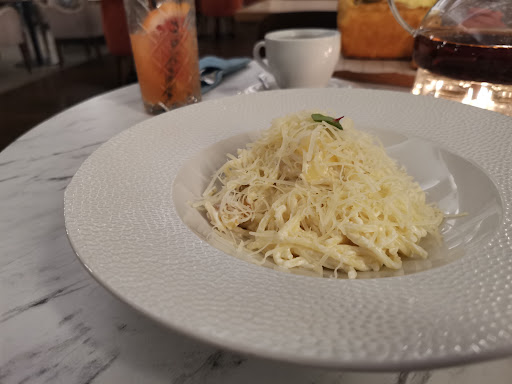 Read moreНашли с женой этот ресторан, посмотрели, что отзывы неплохие, решили сходить. Интерьер приятный, все красиво, но кухня... Заказал пасту в сырной голове. Мне официант так красиво про нее рассказала, что они сами варят пармезан, и он не уступает по качеству настоящему. Подготовка конечно красивая, выкатили телегу, с этой головой пармезана, девушка официант, минуты две грела ее горелкой, добавляла коньяк, поджигала, что-то перемешивала, творила какое-то волшебство. Но по итогу, во все это волшебство, которое творилось две минуты, были выгружены перевареные макароны, которые приготовил повар, в сухом сливочном соусе, которые уже успели остыть. И понятно, что если соус не жидкий и не горячий, пармезан не будет в нем растворяться, но повара видимо этого не знают, и не сказали это офианту. На вкус как спагетти из пачки, без соли и специй, в сливочнй пасте, соусом это назвать нельзя, слишком сухой 😰 Внутри был спрятан кусок расплавленного и застывшего, пармезана. Кусок пармезана, к слову, был добротный, размером со столовую ложку с горкой. Все...