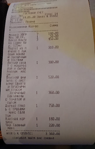 Read moreПосещали в мае 2021г., в обеденное время, парой. Неплохое место рядом с центром города. Прикольный интерьер, как будто пришел в гости к любимой бабушке - нарочито разные столы, стулья, занавески и, конечно же, абажуры. Зал интерьерно разбит на зоны (разные обои, стилистика), многие столики естественно отгорожены от соседних предметами интерьера, что создает более приватную обстановку. В зале играет ненавязчивая и приятная музыка. Меню небольшое, и я всегда отмечаю это как плюс. Чем копаться в бесконечных пиццах, роллах и пастах, всегда приятнее увидеть перед собой в меру лаконичный набор блюд. Порции большие - это всегда плюс. Ценник средний, явно с расчетом на туристов, обед на двоих (закуска, салаты, горячее, пара бокалов вина и чай) обойдется порядка 3,5т.р. По кухне очень понравились запеченные баклажаны, салат с моцареллой и сыровяленым мясом и паштет (утиный, очень вкусный). Шницель назвал бы обычным, но смородиновый соус перевел его в разряд классных. А вот дорадо на гриле подкачала - в середине была плоховато прожарена и повар не удосужился удалить жабры, которые сильно горчили. Белое сухое испанское было вкусным и не дорогим. То же могу сказать про чай "Таежный микс". Отдельное спасибо за теплое молоко с медом, которого нет в меню, но которое сделали по запросу без проблем. Напоследок еще немного "не понравилось" - возможно это особенность занятого столика, потому что сотрудники кучковались где-то прямо у нас за спиной, было очень хорошо и отчетливо слышно как кто-то из них (предположительно, администратор) очень смачно матерится в процессе общения с коллегами (ладно бы разносила за что-то, но просто будничное общение - вы же в зале, а не в курилке!). Тем ни менее, с нами официанты были очень вежливыми и обходительными. В целом, место понравилось, рекомендую к посещению, не смотря на дорадо и сквернословящих...