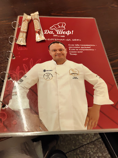 Read moreПолучили эстетическое и вкусовое удовольствие при первом посещении бургерной-ресторана 'Да, Шеф' Окружающая обстановка, интерьер и ожидание вкусного. Подача блюда весьма интересная в нашем случае - гамбургер подан на сковороде с надписью :"Да, Шеф" . В день посещения, на кассе, принимал сам Шеф - Тахир.., при этом, успел просветить, что булочки для гамбургеров пекут сами, поэтому лучше есть сразу, пока хрустят. А мраморную говядину, 🥩подготавливают и готовят сами, при этом, говядину привозять из другого города, если не ошибаюсь-Липецка, где выращивают специальную породу бычков для будущей мраморной говядины🤷. Сопутствующие ингредиенты для гамбургера также отборные. По настоятельному совету Шеф-повара, для первого посещения, рекомендовано приготовленный заказ съесть на месте, не на вынос - это для того, чтобы насладиться и почувствовать приготовленное блюдо 'с пылу-жару' и хрустом булочки, а также свежесть и сочность ингредиентов. 👍 В общем, последовали совету и пока ожидали в уютном сиденье, у окна с видом сотрудников, творящих своё дело, мы стали рассматривать и восхищаться мелочами обстановки и дизайна. Занимательное местечко. Результат...