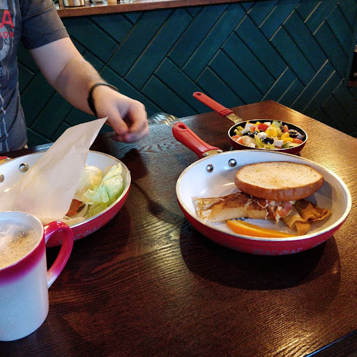 Первое, что сразу смутило, когда я вошла внутрь - меня никто не встретил. Нет никакого администратора, нет официантов, только персонал за стойкой, где все и происходит. Длинный, узкий зал заканчивается... ничем. Я прошла до конца, чтобы найти хотя бы один низкий столик, но была вынуждена вернуться к началу, чтобы со второй попытки забраться на кресло (оно же по совместительству подоконник). У меня средний для Владивостока рост, но это не помогло мне в взбирании за стол, чтобы попробовать что-то новенькое. Мой муж, кстати, достаточно высокий, но ему было не комфортно за столом такого формата. После того, как мы уселись, нам вручили меню и объяснили дальнейший порядок действий - сидим, выбираем, встаём, идём к кассе, оформляем заказ, возвращаемся за стол, ждём его выполнения, идём к стойке, забираем заказ, возвращаемся к столу, взбираемся на стул, кушаем. И если вам захотелось больше, чем только один стейк или бургер, то ходить вам тоже придется больше. Напитки подаются в одном конце стойки, горячие блюда и салаты - в другом, а десерт... за ним вообще пришлось побегать - сначала отправили к кассе, а потом чуть дальше, где поставили на стойку - забирайте, мол. И все это, напоминаю, сопровождается высокими стульями. Посуда требует особого внимания и возмущения - сковородки! Да, мы все ели со сковородок! И если сначала я улыбнулась, то потом сильно смутилась и боялась, что ко мне сейчас подойдут и дадут по шее за то, что я режу ножом и скребу вилкой по сковороде. А учитывая, что они ещё и с ручками, то на столе поместилось лишь три блюда, для остальных места не хватило бы ни при каком раскладе. Кстати, поев, мы убрали их в сторону и места больше не стало. Омлету с помидором и яйцом больше подойдёт название Омлетный блин. Сочный, суховатый с краев, наполненный вкусной начинкой блин. Вот только зачем прикрывать его половиной бургерной булки? Для меня это стало загадкой. Бургер Протеин стайл так и вовсе огорчил своим вкусом и комбинацией теплой котлеты с холодными овощами. Даже если, котлету приготовили только что, она успела остыть от такого ледяного соседства. В кофейной карте вы не найдете Латте. Зато есть Руссиано. Что убило меня наповал. Как и капучино, который я не смогла допить - худший кофе в моей жизни. Порадовал лишь десерт, да и то не до восторга. Вкусный сливочный чизкейк подаётся в непривычном бумажном стаканчике. И это вкусно, но крошка портит все - съесть его аккуратно просто невозможно. А дискомфорт от того, что вокруг тебя на столе грязь, не даёт насладиться вкусом в полной мере. Особого внимания заслуживает такой пункт меню, как Handmade чай. Вот тут стоит рассказать подробнее. Имбирный чай с лимоном оказался простой горячей водичкой с лимонными дольками, подаваемой в френчпрессе без крышки. А рядом, на стойку нам положили... чайный пакетик Гринфилд! И это чай ручной работы за 120 рублей! Так и писали бы - Чай "сделай сам". Никто не примет заказ за столом, никто не уберет посуду, никто не принесет блюдо. Все сами - прыгайте со своих высоких стульев и снова взбирайтесь на них. Растрясите неаеденные калории. Причем, не заслуживающие таких усилий. Название Да, Шеф! стоит произносить не так, далеко не так. Скорее - Да! Шеф! А лучше и вовсе Нет, шеф! потому что лично мы сюда больше не придем. Даже чтобы попробовать...