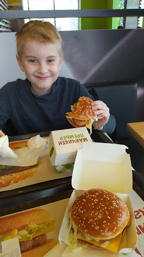 Были в этом маке утром. Работников много а толку мало, 2 чела в живой очереди без макавто облслуживали минут 15-20. Сделать заказ через терминал не получилось, так как отсутствовали электронные номерки. Менеджер сказала что все номерки клиенты разобрали, но поднявшись на второй этаж из клиентов 2 человека всего за столами и без номерков, а номерки стояли на пустых столах. Со столов не убрано. Антисептик отсутствовал в емкостях. Мыло в туалете отсутствовало. Один из двух больших умывальников не работал, туалет грязный, хотя в листе стояла отметка что была уборка выполнена, а я зашел туда через пять минут. И это вме после открытия, в практически пустом ресторане!!!! Отдельно хочется отметить организацию въезда и выезда с территории. Видимо при проектировании такая организация была единственно возможной, но за такое ее исполнение авторам и согласующим органам в том числе гайцам минус 10балов. Совершенно безграмотно. Мало того что въезжаешь под острым углом к дороге, в гору и сразу из-за поворота, так еще и выезжаешь сразу в полосу движения, подставляя левую сторону автомобилям выскакивающим из-за поворота, обзорность нулевая. На территории много парковочных мест, но большая часть похоже занята автомобилями сотрудников, так как в маке посетителей было в это время несколько человек. Место для курения оборудовано прямо на парковке. Разгрузка осуществляется также на парковке. При этом припаркованные авто перекрываются. Грузчики вежливые в отличии от манагера. В молодости работал в маке, и за такое состояние ресторана к открытию, да и вообще наказали бы... В общем это пока худший из встреченных Макдональдсов... А еда...