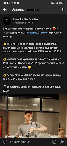 Ну наконец то побывали в данном месте. Признаюсь сразу, повелись на маркетинговые рекламные акции в официальной группе VK. Визит 18.01.2019. Хотели попробовать хвалёный суп Том Ям. Ну что можно сказать, да действительно лучше чем в тануки, но если вы вкушали настоящий Том Ям то я бы его оценил на 3 из 5. Персонал вежливый внимательный и приветливый, к этому нарекания нет, даже похвала! Спасибо. Но все их старания перечеркнула куча минусов и развода маркетологов. Зал небольшой, столов много, и по этому столы стоят очень близко друг к другу, как в Макдональдсе. Сидишь и слушаешь о чем говорят соседи. Интерьер, по мне так себе, но это ведь рыбный ресторан, а не концертный зал, по этому сойдет. А вот основное по поводу развода, и привет администрации и маркетологам! Как я и писал в самом начале. Зная что это очень дорогой ресторан с маленькими порциями. Пошли из-за рекламной акции "с 13 по 19 января сковородка с мидиями, двумя видами креветок и вонголе под соусом том-ям по специальной цене 875Р вместо 1750Р". Но к сожалению официантка сказала что "данной акции у них нет по техническим причинам (нет сковородок) а новость-акцию в группе по чудесному случаю забыли удалить" Лично мое мнение, это заведение просто пытается накрутить побольше рекламы, рассылая спамерные СМС и постя не существующие акции в VK. Им плевать абсолютно на их репутацию в дальнейшем.