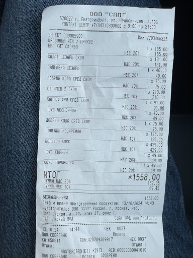 Read moreБыла в Екатеринбурге проездом, с тремя детьми с тремя багажом.Через 3часа на поезд,но мне стало очень плохо,не было состояние чтобы куда-то уехать, СПАСИБО ОГРОМНОЕ МЕНЕДЖЕРУ заведения ДАРЬЕ, вызвала скорою пока ждали,час она стояла рядом.Помогла с детьми, вызвала такси за свой счёт.И весь персонал очень вежливый, и покушали дети вкусно и с собой собрали быстро заказ. ОГРОМНОЕ ЧЕЛОВЕЧЕСКОЕ СПАСИБО. НЕ...