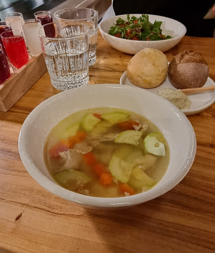 Честно,ожидал большего! От антуража и еды. Нельзя сказать,что плохо,но самый подходящий эпитет-обычно!Учитывая предыдущие проекты команды.Заказывал куриный бульон с овощами..вот просто варёная курица в горячей воде,овощи(особенно огурец) спорное решение.Аналогичное блюдо можно заказать в "Вилка и ложка"рублей на 300 дешевле. Но мы не про цену,мы про вкус.Гребешки с цветной капустой и сыром тоже не впечатлили!На мой взгляд ,это месиво просто оттенило вкус гребешка,никак не подчеркнув его. Гёдза с креветками понравилась,пришлось добирать ей после первых двух блюд.Хочу отметить настойки! Очень качественное исполнение и разнообразие вкусов. Неплохое мороженое.Девочки официантки и хостес молодцы! Весёлые и учтивые,обслуживание быстрое,качественное. Буду ли посещать ресторан ещё раз? Вряд ли,хотя шанс нужно давать! В любом случае,всему коллективу...