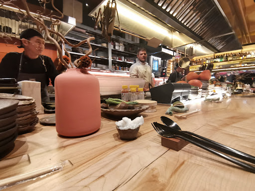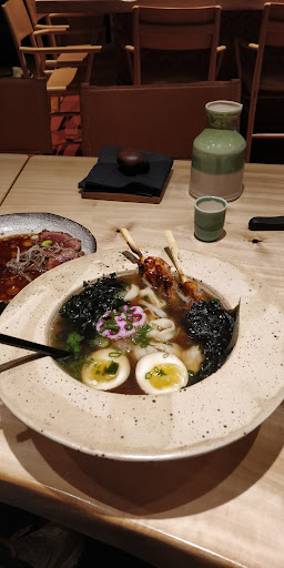 Меня формат открытой кухни всегда немного настораживал - повара вряд ли комфортно работать у всех на виду. Но здесь настолько мало места что ни о каком другом формате речи идти не может. С улицы смотрится интересно, впрочем, как и внутри. С порога просят оставить верхнюю одежду в шкафу - резонно. Есть места за столиками, но интереснее за столиком перед зоной кухни. Официанты приветливые, меню знают. Вообще весь коллектив молодой, здесь кажется никому и 30 нет, в том числе шеф повару. По еде: свежие хорошие продукты, хорошо приготовлено, подача в целом красивая, вкусно, но без какого-либо восторга. Рамен - единственное блюдо полноценно каллорийное. Сибас - грамм 100 не более, две жалкие полоски рыбехи (см.фото), без гарнира или зелени даже. Возможно, в Японии так принято, не знаю. Фирменные роллы довольно пресные без соевого соуса. Коктейль на японском джине и соевых ростках (или бобах) мне понравился. Лично я считаю что все портит ценник. 3 блюда (по объёму как два, даже полтора) - 1750 плюс коктейль 100мл 550 итого 2300 на лёгкий ужин. Мой вердикт: один раз для разнообразия зайти точно стоит. Но постоянным гостем лично мне не быть, в первую очередь из-за ценника и объёма...