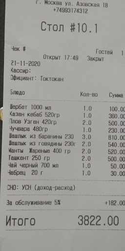 Вкусно. Очень простой интерьер, неалчные для Москвы цены, милое обслуживание, большие порции. А вот в туалет заходить не советую, не роскошно там. Кафе - огромное помещение, в субботу вечером почти до отказа заполненное смуглыми людьми ("блондинами" были только мы), чувствуешь себе как, например, в Бешкеке. То есть сюда надо идти именно за едой. За комфортом и изысками - не надо. Сюда гурманам, готовым к простой, незатейливой, но очень хорошо сделанной пище. Плов (250 р. большая порция) отличный, очень хорошо сделан рис. Мне сказали знакомые киргизы - лучший в Москве. Готова согласиться. Но рис крупный, и без изысков. Если этого не боишься, то очень вкусно. Чай отличный (50 за чайник + 30 за с чабрецом). Казан-кебаб (360) необычный (более сухого что ли типа), но хорош. Жареные манты (260) отличные. Чучвара (230) норм, но второй раз не возьму. Шашлык (270 р очень щедрая палочка) оказался тандырным, а я, как оказалось, люблю только мангальный. Но мужу понравился. Мангальный был только огромной порцией человек на 6 за 2000. За чужими столами смотрелся отличным. Литр компота из сухофруктов - 100 руб. Знакомые еще лагман сухой хвалили, мы в следующий раз попробуем. Поварам и организаторам - спасибо! В нише простой, но очень хорошей еды - уникальное для...