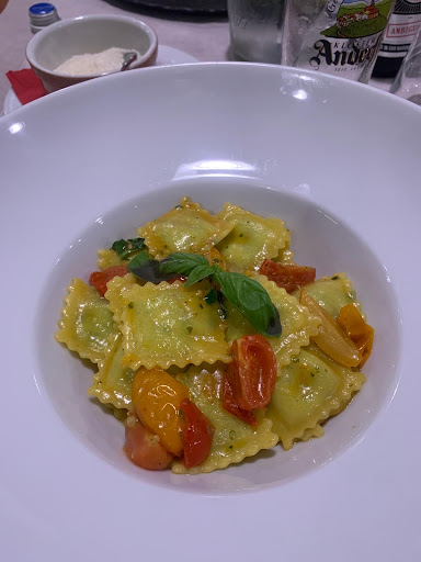 Read moreMi sono fermato per caso durante una visita domenicale a San Marino. Il locale è arredato con gusto, un mix di vintage e moderno con una vetrata da cui si gode di una bellissima vista della costa adriatica. Il personale ci ha accolto cordialmente, quello che credo sia il titolare o per lo meno il direttore ci ha assistito nell'ordinazione, uomo di esperienza che sa vendere bene il menù e sa quello che vende. Ci hanno offerto come antipasto un fiore di zucca pastellato con del guacamole su un letto di insalatina, molto gustoso. Abbiamo preso poi dei ravioli ripieni di borraggine con fiori di zucca e burrata, una grigliata mista, delle patate arrosto e un semifreddo al pistacchio. Tutto buonissimo e impattato a regola d'arte. Tornerò a provare anche il menù di pesce che mi è sembrato molto interessante e magari la pizza. Prezzo adeguato e...