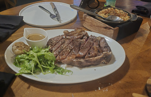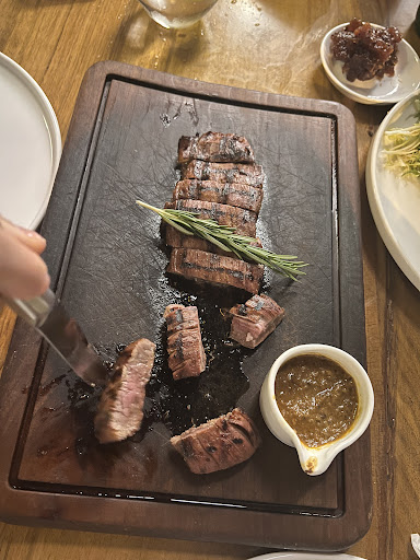 The service left much to be desired. For example, the complimentary butter, which was lit like a candle, wasn’t explained by the waiter. He simply placed it on the table alongside the bread, leaving us unsure if it was meant to be butter or just a decorative candle. The Wagyu Ribeye was beautifully cooked to the desired doneness and melts in the mouth, as any wagyu steak. It would be great if it came with some complimentary Dijon mustard or sauces, this we had to order extra. On the other hand, the Short Ribs were disappointingly dry, relying heavily on its sauce for flavor Honestly speaking, we've had far better ribs elsewhere in Riyadh.