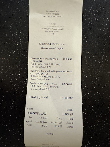 Read moreالسلام عليكم.. كملت اليوم ثلاثين سنة رسميا.. وقلت يبيلها سوشي واخترت موساشي علما اني ماقد جيته ولا جربته ومجرب اغلب مطاعم السوشي بالرياض.. جدا جميل من ناحية التغليف والتقديم والطاقم واهتمامهم بالتفاصيل اما اللذة متفوق وبجدارة طلبي كان ( صن شاين سوشي - وتمبورا روبيان - فيلاديفيا سوشي - جيوزا الروبيان ) وكلها لذيذة استمر على شغلك هذا ياراعي الحلال وابشر بالزيارات مني...