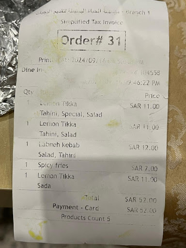 Read moreاولاً الله يبارك لكم في رزقكم ثانياً الاكل لذيذ جداً خصوصاً تكا لومي وكل الإضافات عليها لذيذة بشكل وكباب الدجاج لذيذ بعد البطاطس المبهر كان عادي بطاطس جاهز وفيه بهارات وفيه موظف كويس نسيت اسمه مادري اسامة او وسام نسيت اسمه المهم خدمته سريعه ويقترح عليكم...