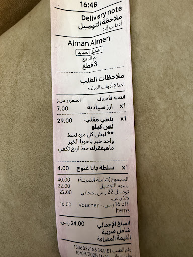 شهادة لله الاكل جميل جدا بس قلة زوق اوي اللي بيحصل ده بجد خلاني مش هفكر اطلب من عندكم تاني انا كل ٣ ايام بطلب من عندكم وعندي اثبات ب كده عن طريق كيتا كل ماطلب الاوردر ممكن يخش ف 54 ريال رز بلطي مقلي شربة سي فود اوقات بجيب نفس الاورد واوقات بجيب سمك ورز بس كل مره يجيلي الاوردر من غير عيش كل مره انهارده من نص ساعه طلبت وكتبتلو ملحوظه انه يزود العيش مش هيفقر المطعم يعني موضوع العيش ده دي كلها ريال ولا اتنين ريال عن تجبلي الاوردر ب واحد خبز بس ده اللي هو اسمه اي عشان اطلب اوردر ب ٤٠ ريال والطعم مش عايز يحط حتي اتنين زياده طب عل الاقلل حط خانه فيها اني ازود عيش مش هاكل انا برغيف واحد دي اسمها قلة زوق من المعبة ولازم ادارة المطعم تشوف مين بيحضر الاوردرات...
