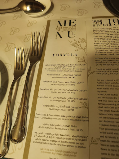 Read more-A special experience. Menu is very simple, 5 kinds of steak all served with the famous cafe de paris sauce with fries and salad, they give bread with butter and tapenade as a starter also. -Service is beyond perfect, the philipino waiter was very attentive, knowledgeable, polite and professional. -The steak was delicious. -Prices are very high though especially compared to portion, yes i understand the quality used is top notch and the sauce is totally worth the hype, but definitely not a 400 sr steak. -Also, when paying 2000 ryal for 5 people lunch you expect the system not to be down!! We couldn't get the invoice (they emailed it to us) and the ccm machine was not working we had to pay cash. When you face this after paying average 400 sr/per person you expect the manager to give something complimentary coffee or sweets, but he just said sorry for that. -The interior of the restaurant and the ambiance...