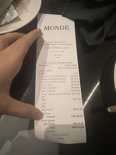 Read moreDespite its high rating, Monde fell short of expectations. While the food was undeniably delicious, the overall experience left much to be desired. The service felt awkward and lacked the attentiveness expected from a restaurant that presents itself as fine dining — especially given the inflated prices compared to other breakfast spots in Alahsa. Simple details, like asking how I would like my eggs cooked, were overlooked. Additionally, the atmosphere was let down by poor restroom maintenance, which didn’t reflect the restaurant’s upscale image. One staff member took my name and phone number without even inquiring about my experience, missing an opportunity to address any concerns. If not for the quality of the food, the rating would have been lower...