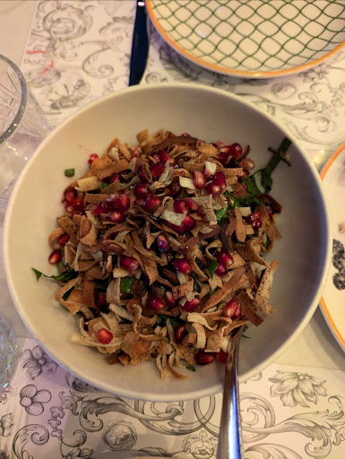 The hummus with walnuts was creamy and rich, while the fattoush and tabbouleh were crisp and well-balanced. The meat and cheese sambousek were crispy and flavorful, while the shish barak (yogurt dumplings) and spicy potatoes stood out.