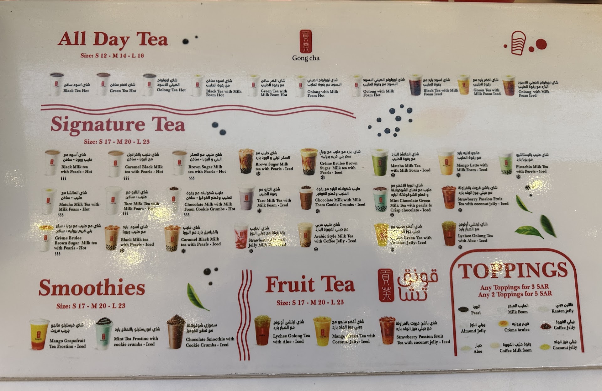 I don’t know why it’s called Gong Cha or whatever the heck this “milk or bubble tea store” is but this is definitely not Gong Cha nor does it deserve to have this name/franchise of this renowned establishment. First, their bestselling Wintermelon Milk Tea wasn’t available on their menu which is understandable. Maybe they will bring it in at a later time. Second, I was excited to order one Pistachio Milk Tea and one Mint Chocolate Green Milk Tea, made both Medium size to-go with the specific instruction of having no boba. The cashier misunderstood my request and placed boba on my second drink and if I haven’t seen them making my order it would be a disaster. Third, the Pistachio Milk Tea should be green (or at least green-like) but what I got is a latte-like bland juice. Can’t even taste the pistachio in there. It’s like buying a milk tea from a public market. Both the cashier and the barista even looked at each other puzzled why the pistachio turned into a latte so something’s up for sure. The Mint Chocolate was a bit okay but far from being one and the food coloring was too bright close to being a neon blue. Fourth, there wasn’t even an apology (the cashier made me feel like it was my mistake of “not telling” her the specifics nor a thank you for coming in and buying any dreadful beverage they have. Such a shame this even existed in the first place. There is definitely 98% need for improvement not just with their products but with their staff as well. Mind you I’m the only customer at that time. I can tell why. My 40SAR gone down the drain. Perhaps I’ll just stick to Tiger Sugar or to any decent or half-decent tea shops in or...