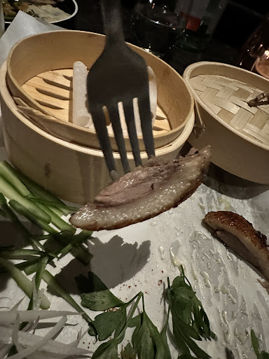 Peking Duck: Disappointing! Pairing an oily piece of roti instead of a traditional spring pancake with a piece of duck covered in the 5 cm layer of fat is not a good idea (attached in photo).