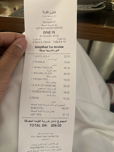 Read moreI recently had a very disappointing personal experience ordering from KanOOn AlQaria via the Keeta app. While I was looking forward to the meal, the overall quality of the food was highly unsatisfactory. The most significant issue was with the meat, which not only appeared to be spoiled but also had an abnormal smell and a suspicious taste. This was not only a waste of a meal but also a major letdown. Given this experience, I would be hesitant to order from this restaurant again. كانت لدي تجربة شخصية مخيبة للآمال للغاية مؤخراً عند الطلب من كانون القرية عبر تطبيق كيتا. على الرغم من أنني كنت أتطلع لتناول الوجبة، كانت جودة الطعام غير مرضية على الإطلاق. المشكلة الأكبر كانت مع اللحم، الذي بدا فاسداً وكانت رائحته غير طبيعية وطعمه مريباً. لم تكن هذه مجرد وجبة ضائعة، بل خيبة أمل كبيرة. بناءً على هذه التجربة، لا اعتقد انني ساعيد الطلب من هذا...