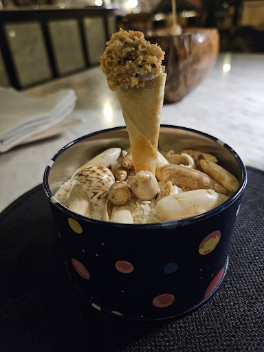 Negative: My plate was chipped - shouldnt happen at this price and the promise they offer. The meat course was nothing special, piece of veal that was chewy with a “grilled leave of cabbage” - a real scam. I didn’t even take a picture of it, it was not pretty. Then followed a berry ice cream - nothing mindblowing, standards were definitely sinking. The worst came at the end - a barbe à papa, DROWNED in rum with whipped creme and strawberries. Where is the creativity there?! There was also no balance at all in the dessert. I sent it back - after just one bite I felt drunk. They came with half a “caramel tart” - a shortcrust filled with caramel and whipped cream. A below average dessert, no creativity, no taste, seriously disappointing. The chef (who didnt seem to spend much time in the kitchen) didn’t acknowledge that the dessert was really not balanced nor inspiring. All in all, too expensive for what they offer. We paid CFA 58,000 for the menu (per person).
