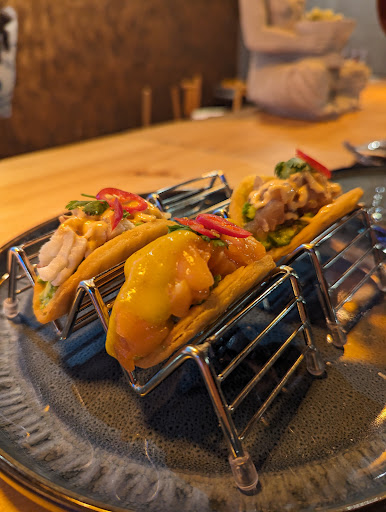 La cuisine alors que dire hormis que la cuisine fusion est quelque chose de risquĂ© mais lĂ c'est un pari rĂ©ussi Les tacos avec du poisson en ceviche et garnitures japonaises sont une tuerie en plus d'ĂȘtre esthĂ©tiquement assez cool. Petite explosion de saveurs, 3 tacos aux 3 goĂ»ts nettement diffĂ©rents. Les chefs sont pĂ©ruviens du coup c'est leur spĂ©cialitĂ© le ceviche et c'est bien maĂźtrisĂ©. Un peu cher pour une entrĂ©e mais ça demande beaucoup de prĂ©paration en amont. Le daki tori bowl est dĂ©licieux , consistant, colorĂ© et complet c'est parfait pour les grandes faim avec un excellent rapport qualitĂ© prix. Pour les rĂ©fractaires au poisson cru, vous pouvez demander Ă ce que le poisson soit cuit. Le sashimi de thon c'est mon pĂ©chĂ© mignon...excellent et les tranches bien larges. Le ramen aux nouilles Ă©tait bon, peut ĂȘtre un peu chiche en nouilles mais consistant en poulet et autres garnitures. Le goĂ»t Ă©tait vraiment trĂšs bon.