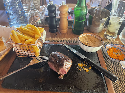 Read moreÀ première vue, le cadre est vraiment réussi : la décoration est soignée et l’ambiance western est bien reproduite on s’y croirait presque. Malheureusement, cela se gâte côté assiette. Nous avons commencé par une assiette de tapas, qui s’est avérée être simplement composée de brochettes de poulet et de bœuf grillé… décevant, surtout quand on commande ensuite des brochettes de bœuf et de poulet en plat principal. La pizza, elle, était bien réalisée, tout comme le tartare de bœuf. La lotte à l’orange, quant à elle, manquait de finesse. Le service était lent, ce qui étonne compte tenu du peu de clients présents ce soir-là. Autre bémol : la piscine longeant la terrasse, totalement trouble, qui semble devenir un véritable nid à moustiques. C’est dommage, car ce petit restaurant à thème, un peu à l’écart des foules, a du potentiel. Il mériterait de mieux fonctionner, mais il lui manque, à mon avis, une gestion plus rigoureuse et un responsable...
