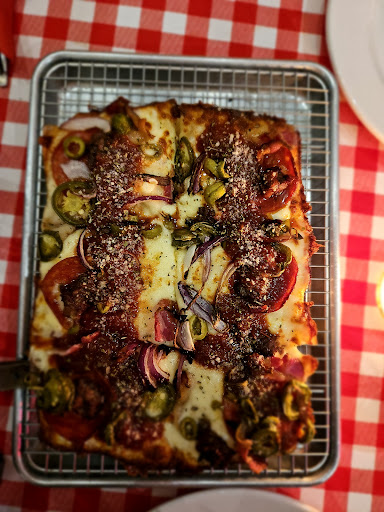 Detroit Style: we got Billy's Signature (1.545 RSD). 4.5 /5 stars At the first bite I thought of cheesy bread or focaccia with lots of toppings. The pizza comes on a grate to let the grease be on the bottom and not have the pizza soggy. The toppings for us were a bit too much, there is pepperoni, sausage, bacon - the taste was overshadowed by the rich flavour of the dough and cheese, onions and jalapeños. Next time we will get a simpler version; cheese, onions and jalapeños will be enough.