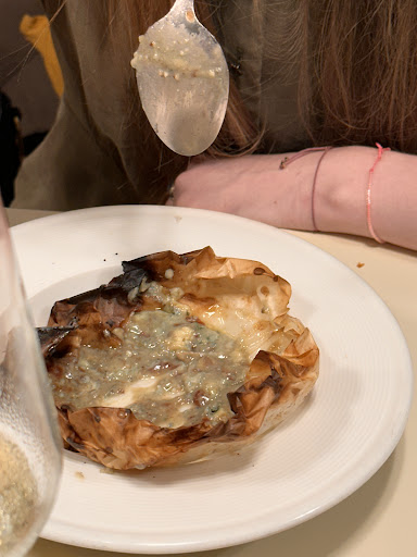 Food: • The ajvar served as “homemade” tasted and felt indistinguishable from a store-bought jar to me. • The baked cheese was so aggressively sharp that I couldn’t eat it; one spoonful left an unpleasant aftertaste for about 20 minutes. • The chicken with mashed potatoes was dry and bland; the batter was hard enough to scratch the roof of my mouth. The mash was perfectly smooth in a way that suggested instant mix. • The pork was simultaneously dry and burnt yet oily, with grease pooling on the plate. The side was a single whole potato, unevenly roasted.