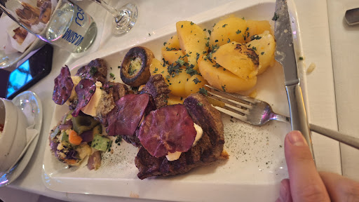 Me and my friends left the place with very unpleasant experience. The waiter (who barely spoke English, if at all, which is strange for such a big and seemingly touristic restaurant) from the beginning didn’t event tried to hide his agitation, when we asked for few minutes more before we make an order (at that point we barely managed to take off our jackets and got the menus). Waiter came 2 more times within few minutes every time clearly irritated. When we order (max 10-15 min after our arrival) everything seems to be alright for a moment. Our food arrived shortly, for this (definately not low price) the portions were satisfactory. Then we asked for the bill, we expected that it should be payed together, so we tried to ask the waiter for a few minutes of time so my friends can revolut money for their dishes to mine account so I can pay for everyone. Then happened something I have never witnessed before- the waiter which was holding the payment terminal threw it on our table, and angrily walked off. Then my friend looking at the bill noticed he was charged more than of the menu- for a dish made of pork, while he ordered and received a chicken one. The waiter when confronted said something like “it is what it is, no chicken, pork”. We didn’t wanted to stay there any longer so we payed and left. Also as a vegetarian I wasn’t satisfied with the offer of the menu- little options to choose from the main dishes- few at most- which again for such big restaurant seems...